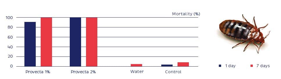 Aby bylo známo, jak účinnou ochranu dokáže inovativní přípravek Provecta zajistit, musel projít nezávislými laboratorními testy. Ukázalo se, že hned první den má jednoprocentní koncentrát Provecty při likvidaci štěnic účinnost 90 %, zatímco dvouprocentní koncentrát dokonce 100 %. Po týdnu je to již v obou případech 100 %. Při hubení much se můžete s jednoprocentním koncentrátem během prvních 24 hodin těšit na 100% účinnost. U drtivé většiny jedinců efekt přichází dokonce již po 5 minutách. Budete-li pomocí Provecty likvidovat šváby, lze během prvních 24 hodin očekávat účinnost zhruba 91 %. Po 48 hodinách se u jednoprocentního koncentrátu můžete opět spolehnout na účinnost 100 %.