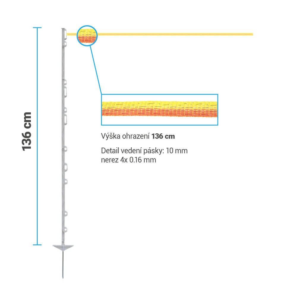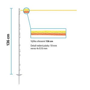 Oranžová páska 10 mm s čtyřmi nerezovými vodiči pro vymezení prostoru až do 250 m obvodu se postará o kvalitní dlouhodobé oplocení. Její oranžová barva je dobře viditelná. S plastovými mobilními sloupky se zpevněným profilem a silnou špicí, vytvoříte výšku ohrazení až 136 cm nad zemí.