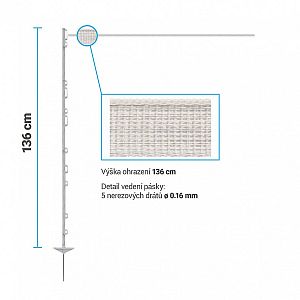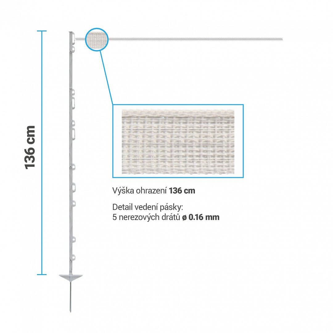 Univerzální bílá páska o průměru 20 mm v délce 200 m zajistí kvalitní dlouhodobé oplocení pro vaše zvířata. Páska obsahuje 5 nerezových vodičů a její zesílené okraje jsou odolné proti povětrnostním vlivům. S mobilními plastovými sloupky instalujete ohrazení až do výšky 136 cm nad zemí. Jejich zesílenou špici oceníte při opakované instalaci.