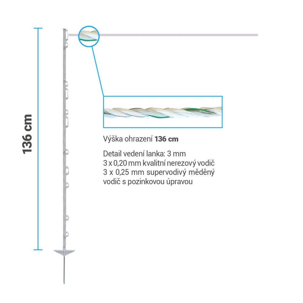 Kompletní sada elektrického ohradníku obsahuje kvalitní lanko s ø 3 mm, s 3 nerezovými a 3 měděnými vodiči. Zajišťují maximální vodivost i při dlouhých a náročných instalacích. Kvalitní plastové sloupky k ohradníkům s maximální výškou instalace 136 cm, bezpečně ochrání vaše zvířata nebo pozemek.