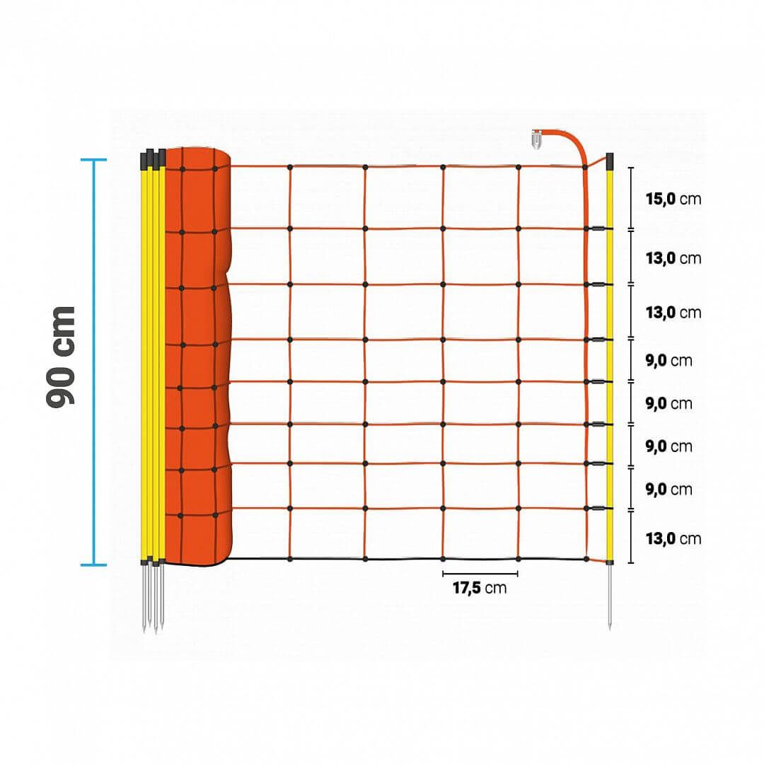 Sada elektrického ohradníku se sítí určená především pro ovce, kozy, prase domácí nebo větší psy. Elektrická síť slouží také jako ochrana stáda, pozemků nebo úrody před lesní zvěří nebo divokými prasaty. Pomocí sítě snadno a rychle vymezíte bezpečný prostor pro chov vašich zvířat, nebo jim zamezíte vstupu do vybraných nežádoucích míst. Elektrická ohradníková síť pro ovce a kozy je velmi jednoduchým a mobilním řešením. S možností instalace až do 50 metrů obvodu a výškou 90 cm.