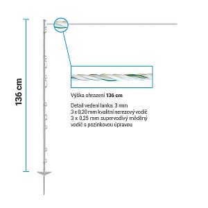 Vysoce kvalitní modré lanko 400 metrů s průměrem 3 mm a měděnými vodiči, zajistí maximální vodivost - odpor 0,17 Ω/m. Modrá barva je pro oko lesní zvěře nejlépe viditelná a působí jako varování před samotným dotknutím ohradníku. Výšku ohrazení až 136 cm vytvoříte pevnými plastovými sloupky s 11 očky pro individuální volbu tažení vodičů. Mobilní plastové sloupky je možné snadno přemisťovat. Zemnící tyč 100 cm pro uzemnění ohradníku.