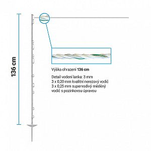 Kvalitní vodivé lano o průměru 4,5 mm je vhodné pro pastvu koní, poníků, a oslů. Především díky tomu, že předchází poranění zvířat při možném střetu s vodičem (neřeže). Balení setu obsahuje návin 200 m. S plastovými sloupky rychle a snadno instalujete mobilní ohrazení do výšky až 136 cm nad zemí. Sloupky disponují 11 očky pro možnost tažení vodičů ve více výškách.