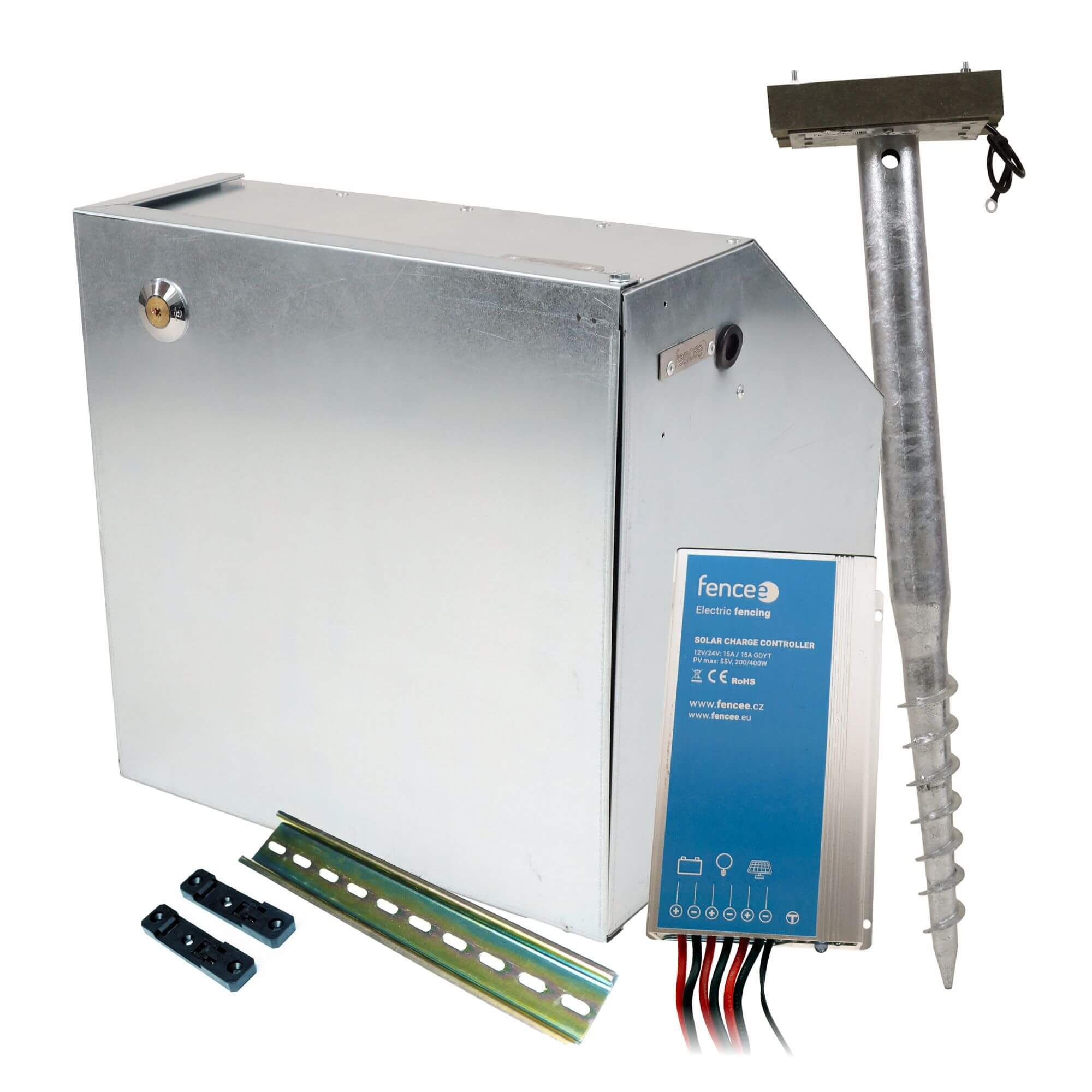 Bezpečnostní schránka na zdroj ohradníku fencee, montážní trn, regulátor 15 A pro panel 200 W