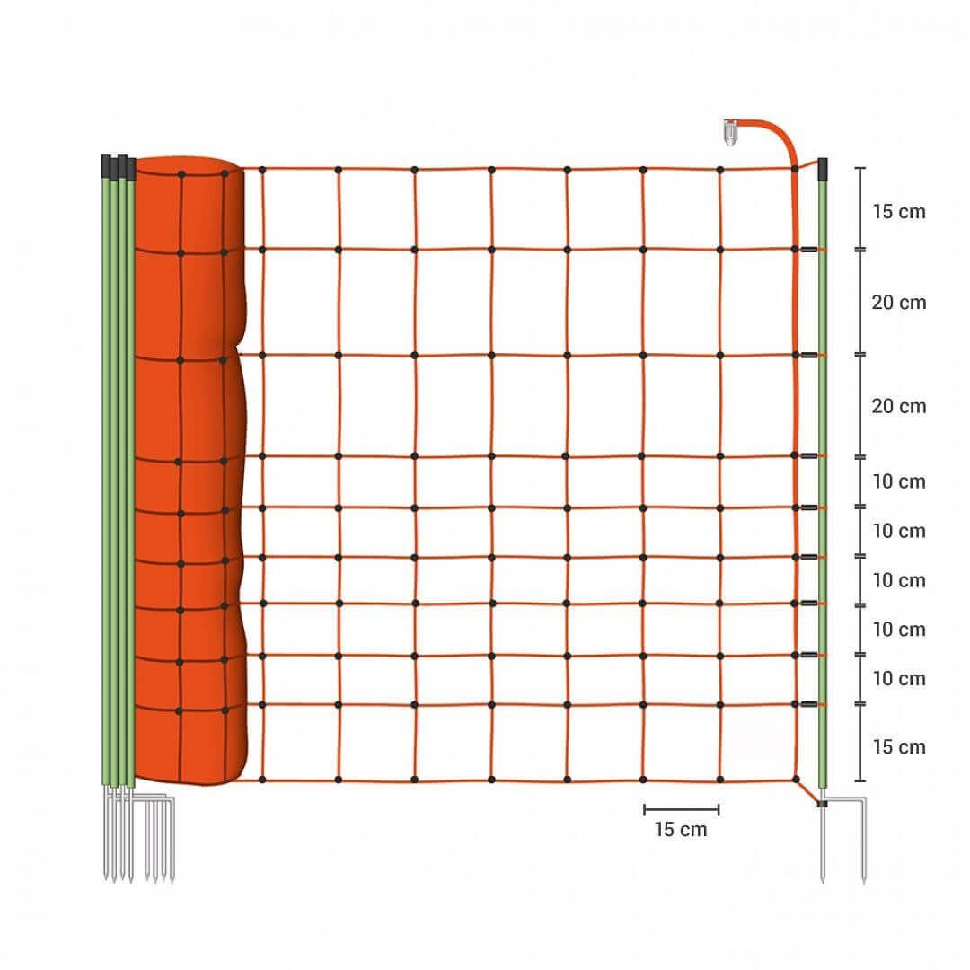 Sada elektrického ohradníku se sítí určenou pro ovce a kozy. Elektrická síť slouží také jako ochrana stáda proti útoku vlka a psa. Pomocí sítě snadno a rychle vymezíte bezpečný prostor pro chov vašich zvířat, nebo jim zamezíte vstupu do vybraných nežádoucích míst. Elektrická ohradníková síť pro ovce a kozy je velmi jednoduchým a mobilním řešením. S možností instalace až do 50 metrů obvodu a výškou 120 cm.