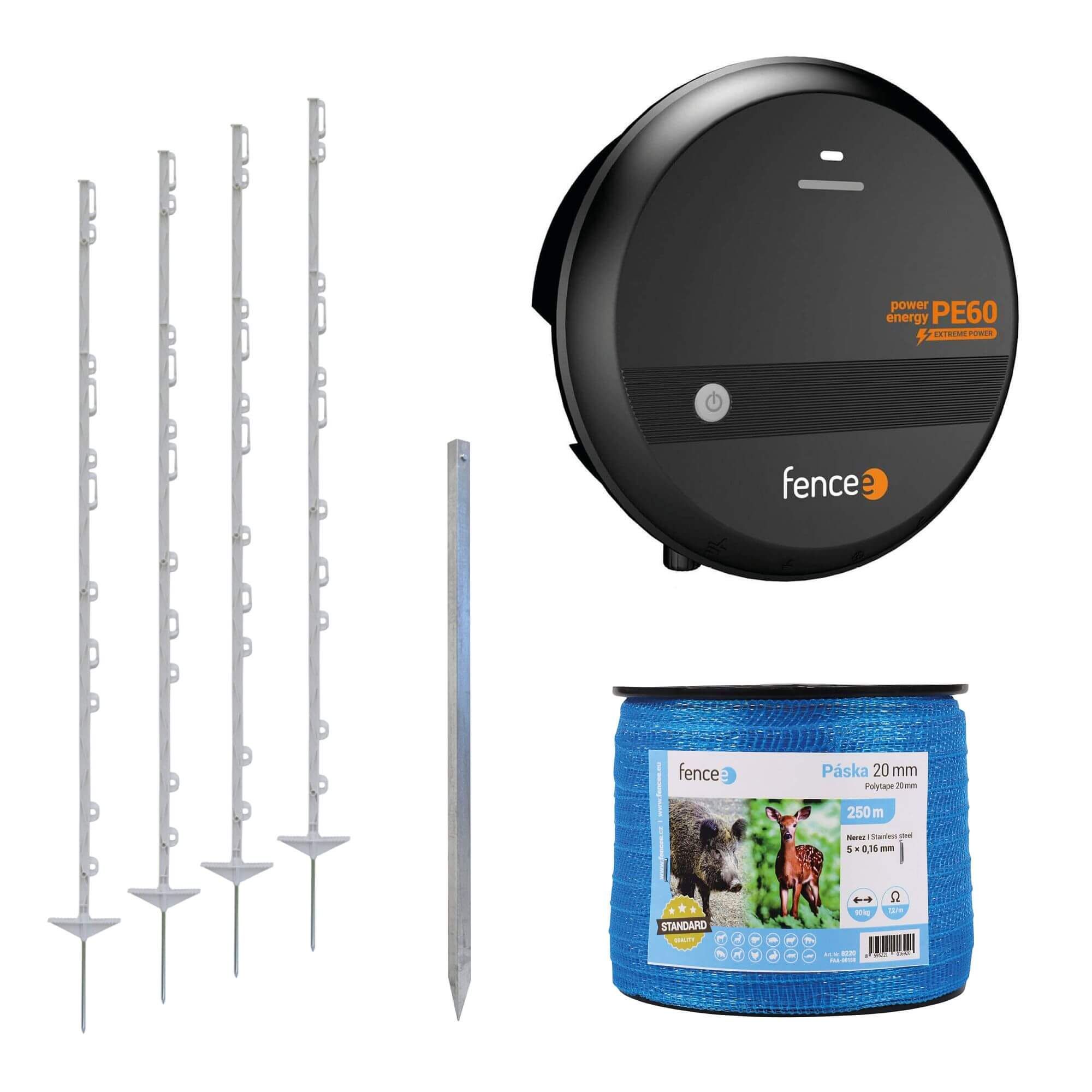 Kompletní ohradníková sada obsahuje modrou pásku s pevným nerezovým vodičem 5 × 0,16 mm. Modrá barva je pro oko černé a divoké zvěře nejlépe viditelná a působí jako varování před samotným dotknutím ohradníku. Páska k ohradníku v návinu 250 metrů je vyrobena z pevného materiálu, který je odolný proti roztržení.