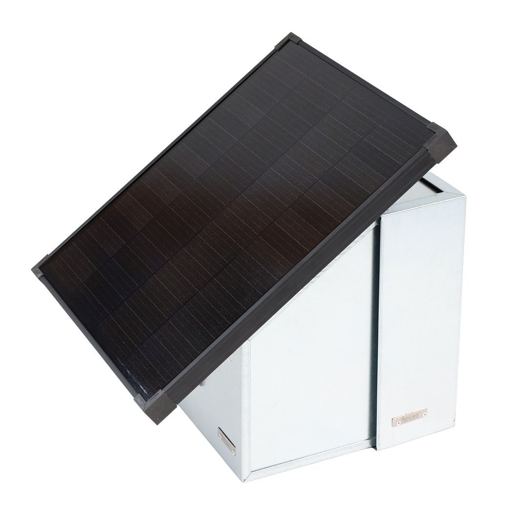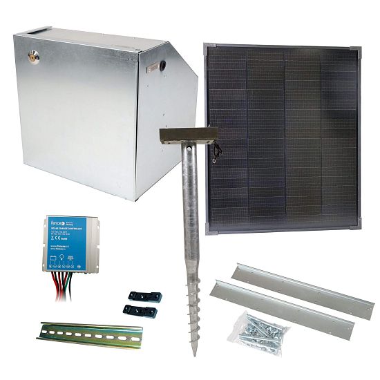 Systém pro solární nabíjení baterie zdroje elektrického ohradníku. Sada neobsahuje generátor a baterii. Baterii a vhodný generátor s kombinovaným napájením je třeba dokoupit.