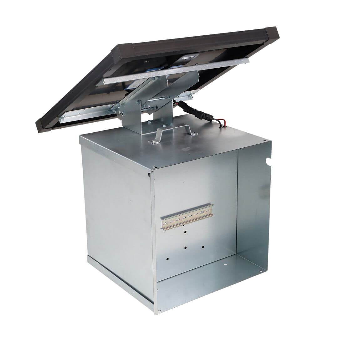 Solární panel 100 W upevněný na přenosné schránce pomocí montážní konzole, připravená DIN lišta uvnitř schránky