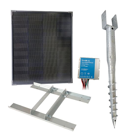 Základní sada pro solární dobíjení baterie zdroje elektrického ohradníku. Sada neobsahuje generátor a baterii. Baterii a vhodný generátor s kombinovaným napájením je třeba dokoupit.