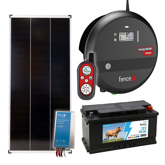Sada solární elektrický ohradník, 8J zdroj s dálkovým ovladačem, panel 200 W, regulátor a baterie 95 Ah