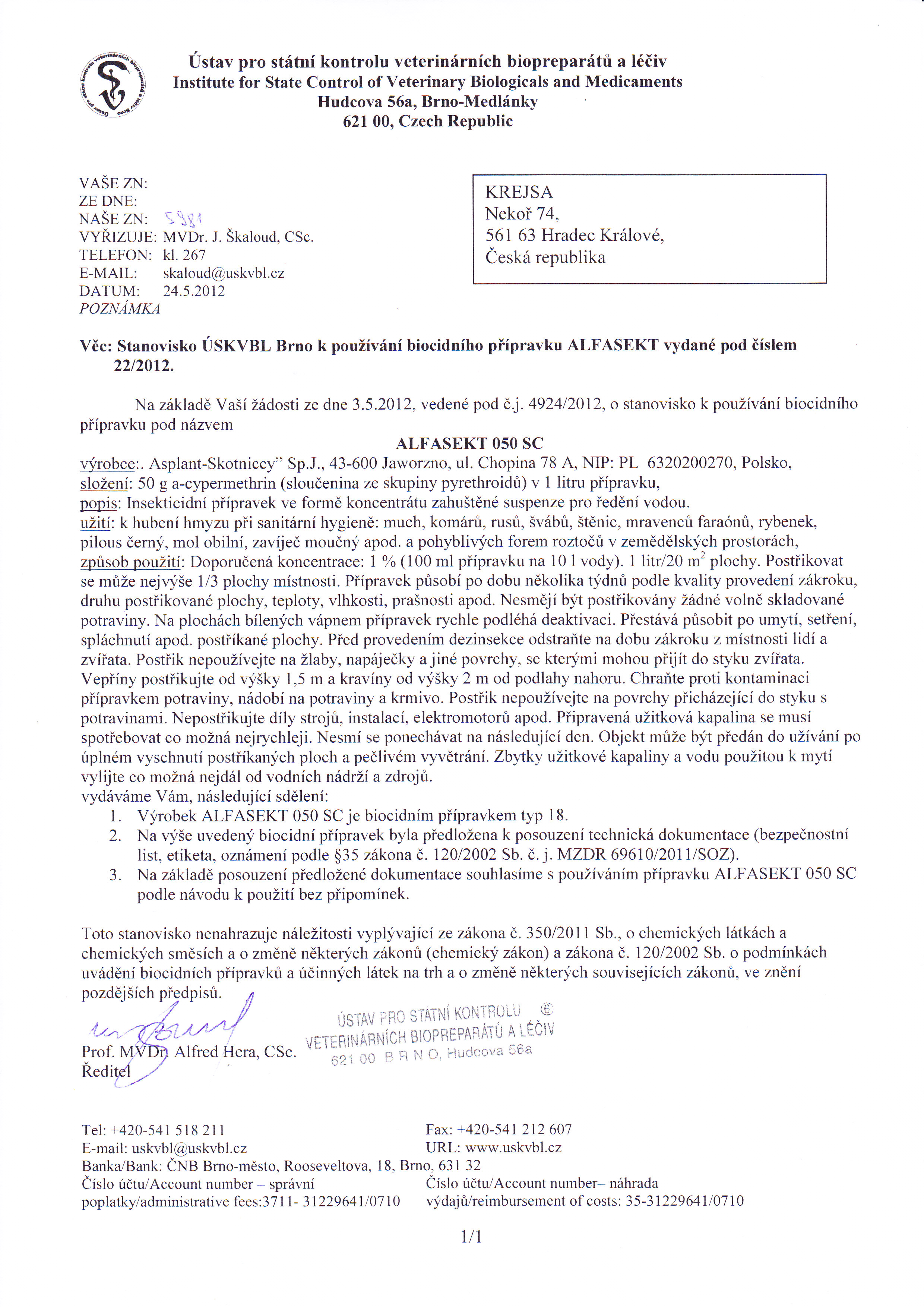 Účinná látka : 50 g a-cypermethrin (sloučenina ze skupiny pyrethroidů) v 1 litru přípravku.