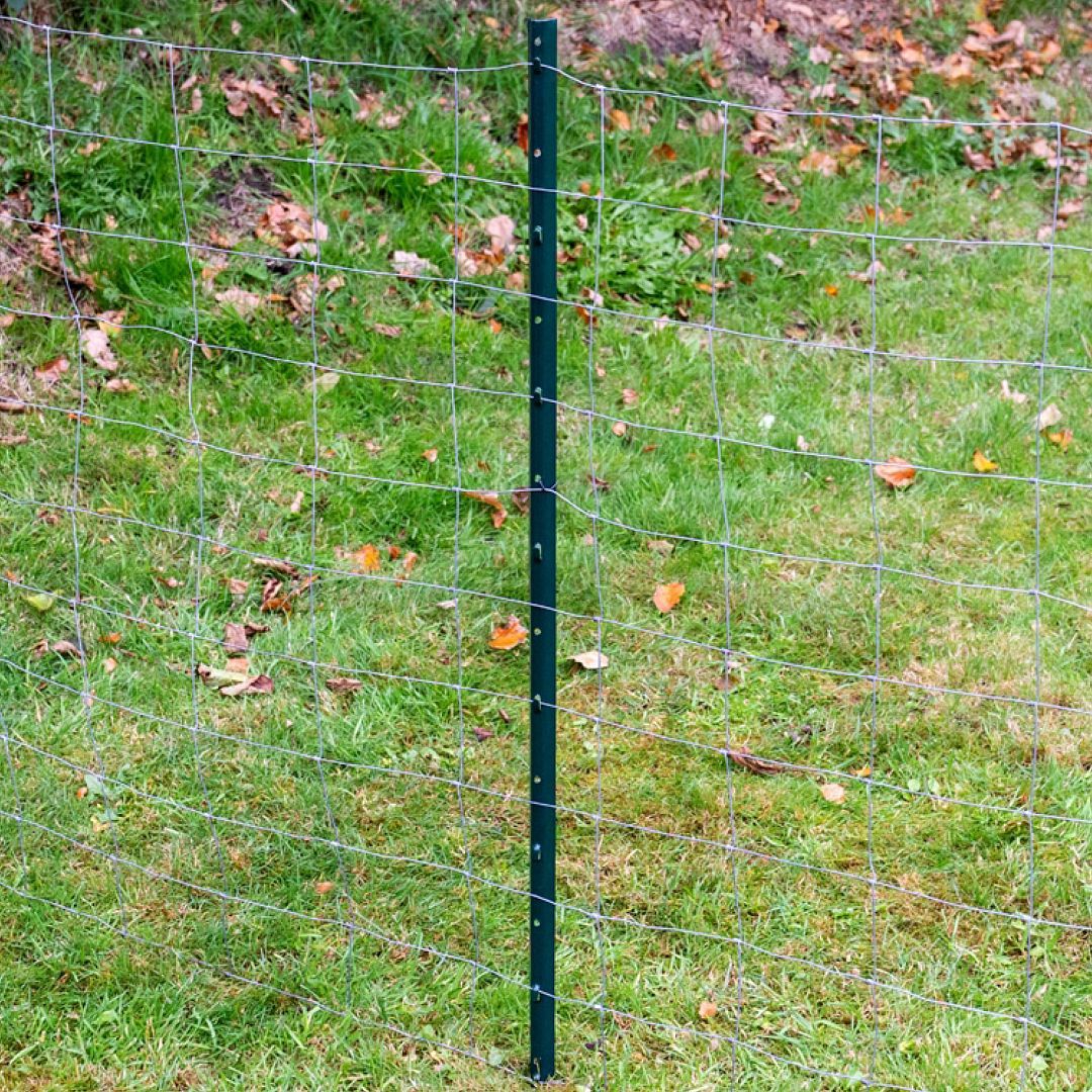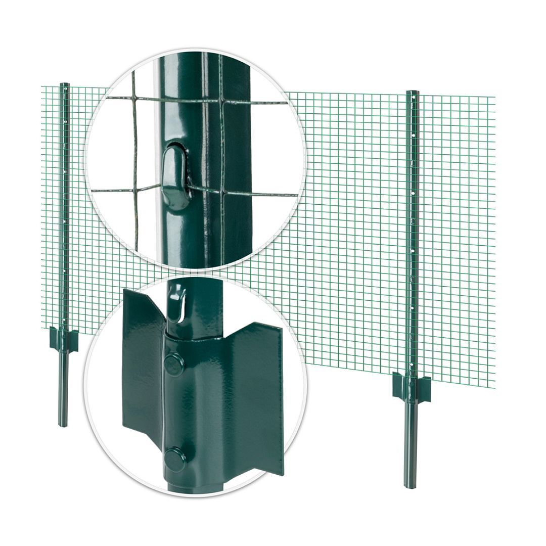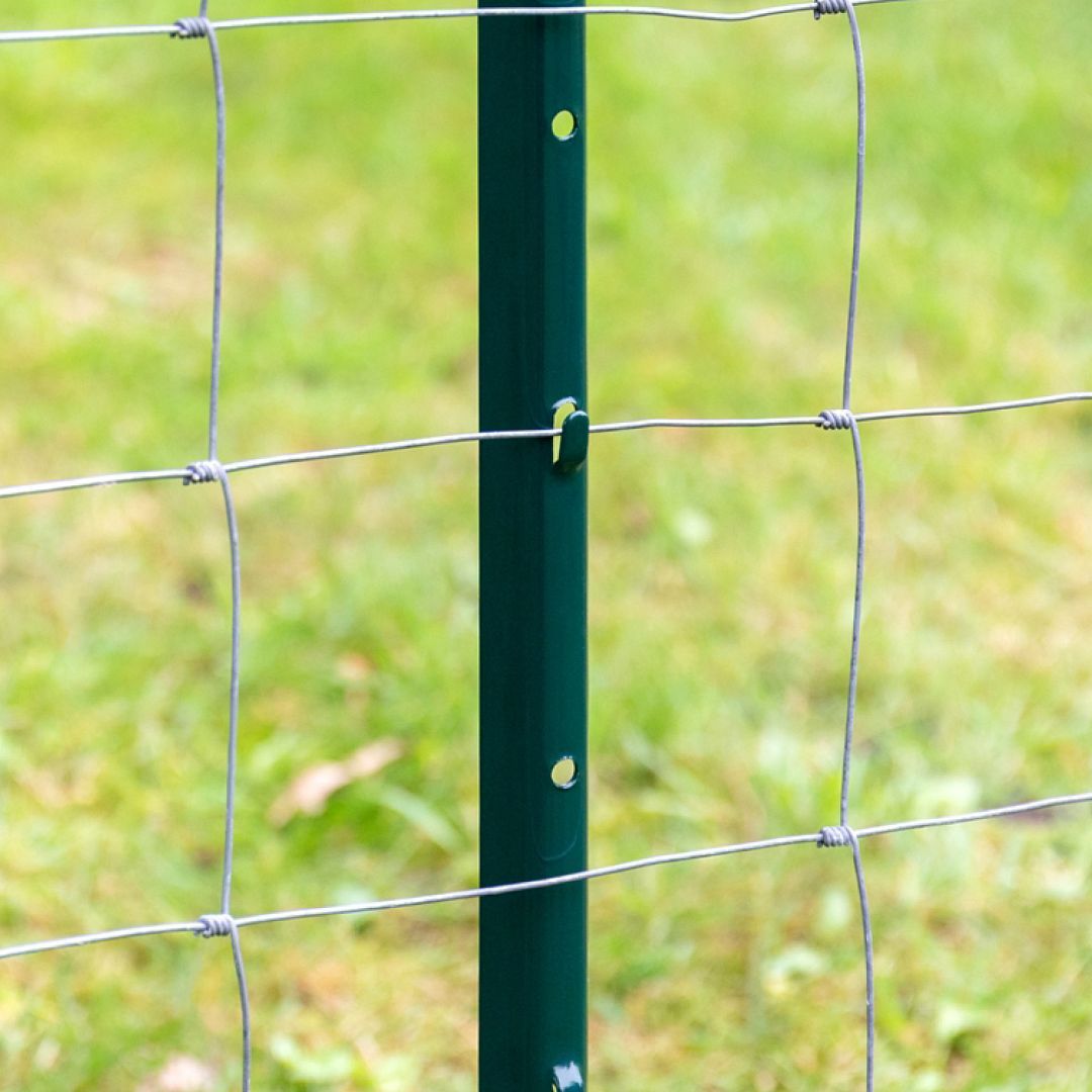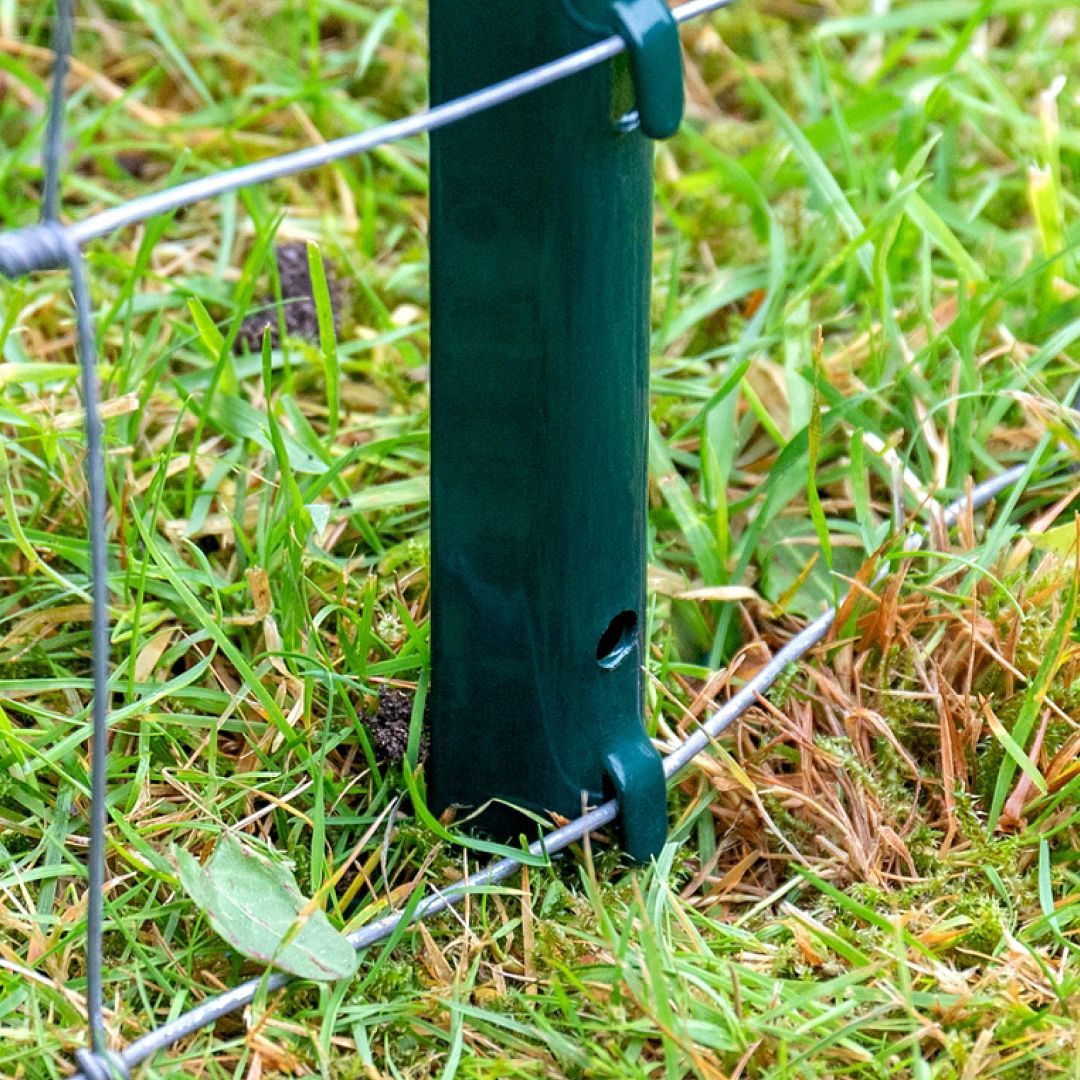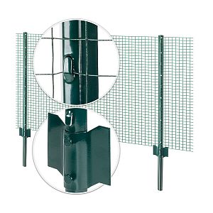 Sloupky lze rychle ukotvit do země díky U-profilu. Nášlapná deska poskytuje oporu a zabraňuje příliš hlubokému pronikání do země. Drátěné pletivo můžete zavěsit na háčky. Navíc můžete plot stabilizovat upevněním plotu vázacím drátem. Na to už jsou ve sloupku díry.