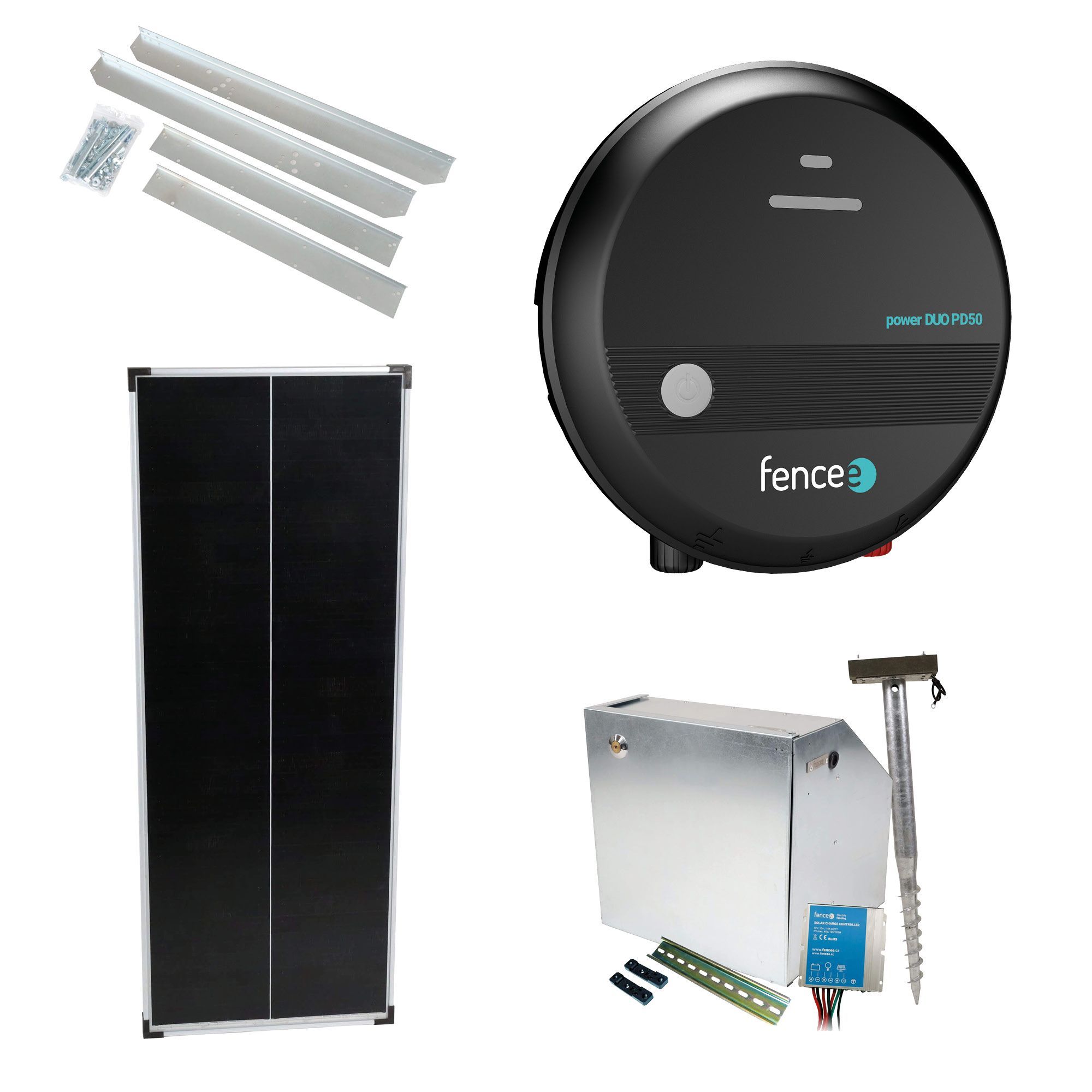 Bezpečnostní schránka pro zdroj elektrického ohradníku a baterii. Elektrifikovatelná kovová akumulátorová schránka s robustním montážním trnem. Schránku lze napojit na zdroj ohradníku, poté je pod napětím – ochrana proti krádeži, 2 × izolovaný klíč k bezpečnému otevření schránky. Včetně kompletní elektroinstalace a uzemnění. Disponuje DIN lištou fencee pro jednoduché a rychlé uchycení generátoru fencee. Regulátor 10 A pro solární panel s výkonem 100 W.