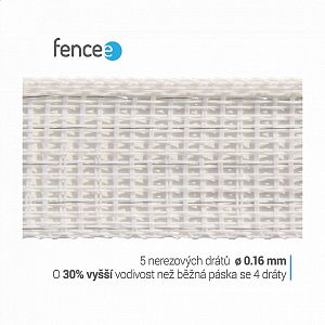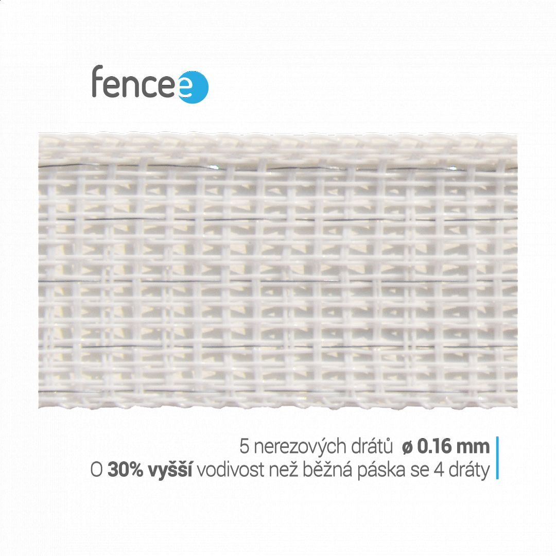 Bílé plastové sloupky 20 ks s celkovou délkou 156 cm, 136 cm nad zemí. Bílá vodivá páska s šířkou 20 mm v návinu 200 m, 5 × 0,16 nerezový vodič. Součástí sady je také zemnící tyč.