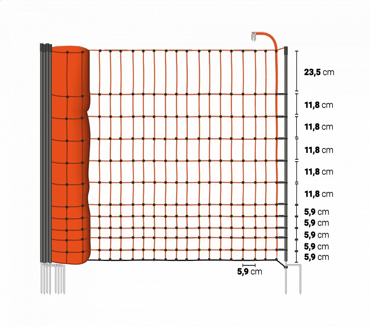Součástí sady je oranžová hustě protkaná vodivá síť s výškou 112 cm a délkou 50 m. Pro mobilní výběh se slepicemi.