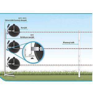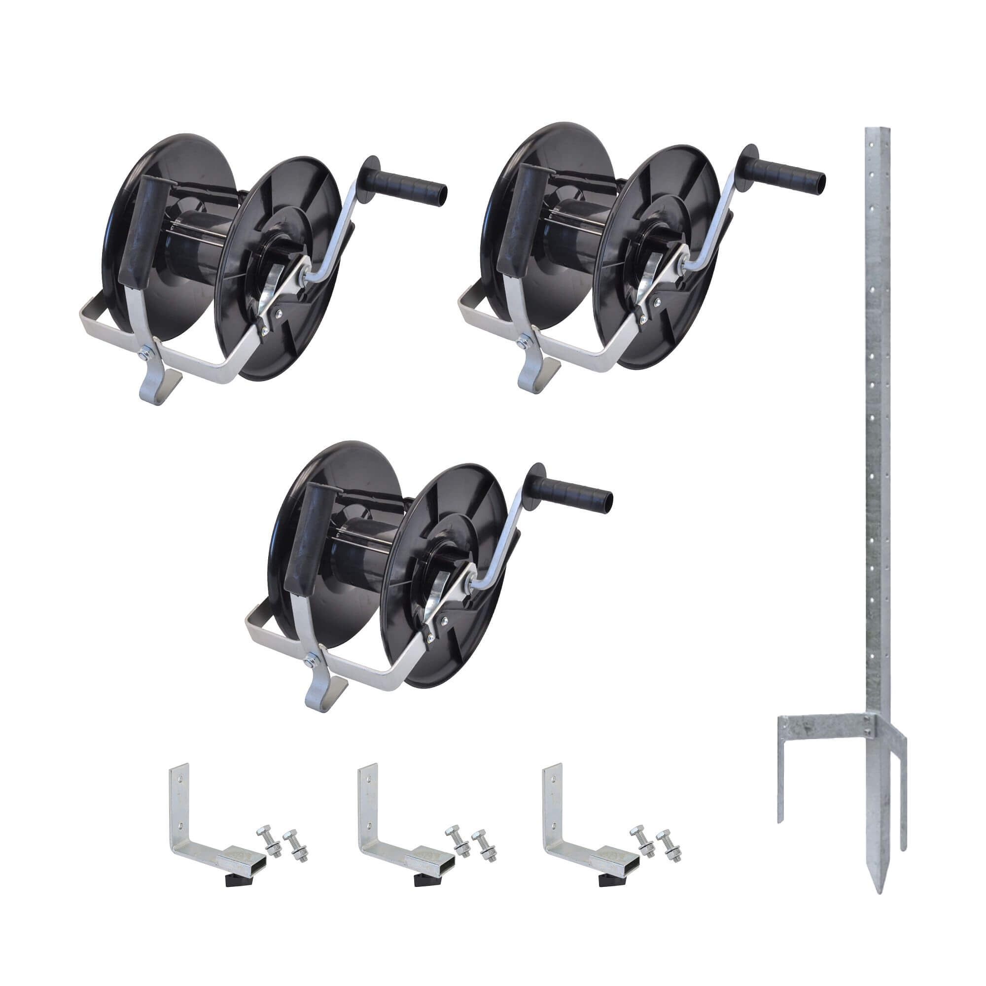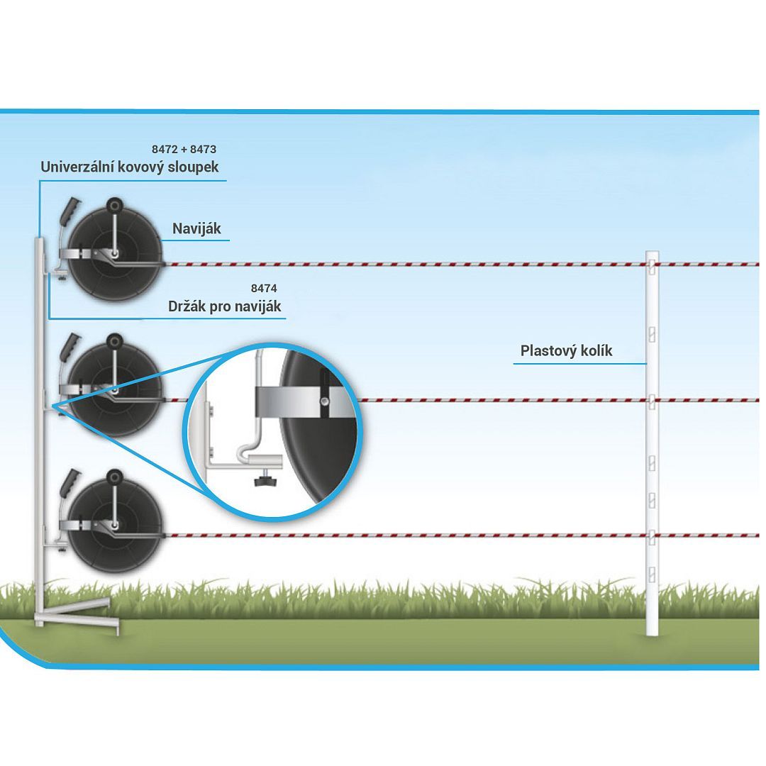 Kompletní sada pro usnadnění navíjení a odvíjení třech řad vodičů najednou pomocí třech navijáků s bubnem 3 : 1 upevněných na univerzálním U-sloupku s celkovou délkou 120 cm (90 cm nad zemí). Naviják disponuje brzdou.