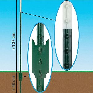 Cenově zvýhodněná sada pro stavitele pevných elektrických ohrad. T-sloupky pro elektrický ohradník s celkovou délkou 167 cm - nad zemí 127 cm. Masivní stupačka zajišťuje bezpečné ukotvení a stabilitu sloupku. Povrchové ošetření pro ochranu před povětrnostními vlivy. Sloupky lze použít opakovaně.