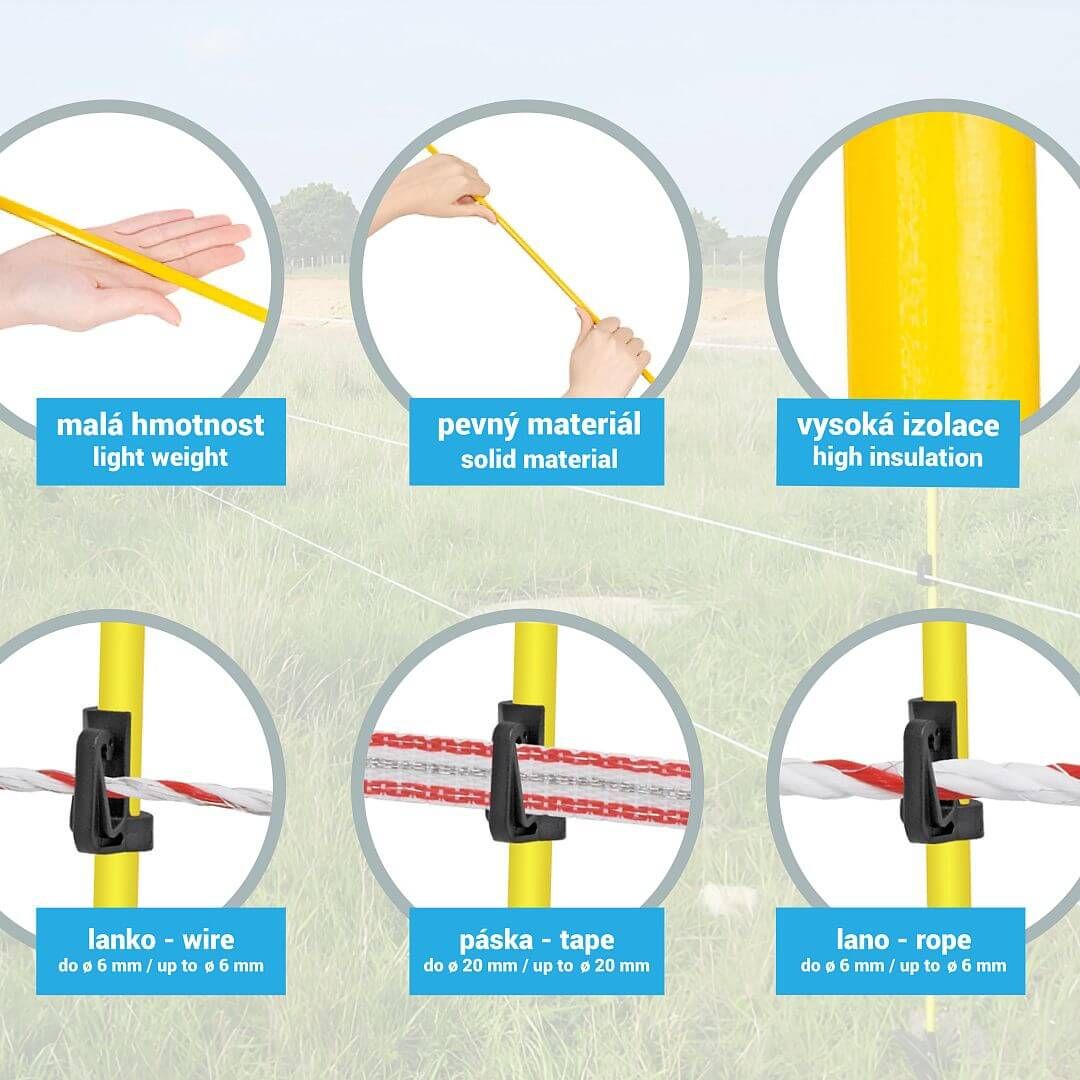 Celkem 20 ks sklolaminátových sloupků s oválným tvarem a výškou 92 cm nad zemí. Nízká hmotnost, vysoká tuhost. Včetně vrchního hlavového izolátoru + 1 přídavný výškově nastavitelný izolátor již na sloupku.