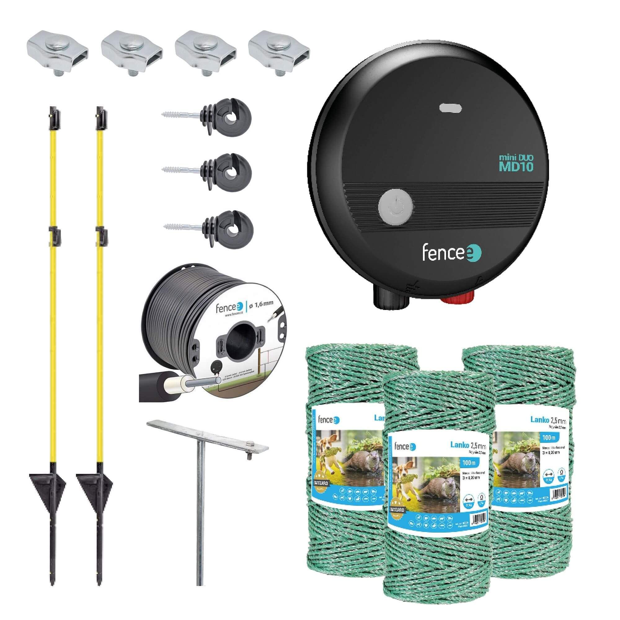 Sada pro elektrický ohradník na zahradu pro kočky a psy - DUO zdroj - sklolamináty - lanko 300 m