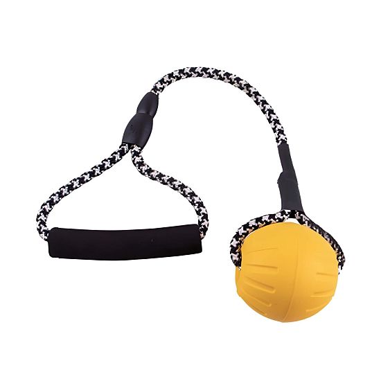 Žlutý míček vyroben z patentovaného materiálu, který je extrémně odolný a zároveň měkký, příjemný na skus. Balonek je na šňůrce, která je zakončena měkkou rukojetí. Průměr míčku je 7 cm.