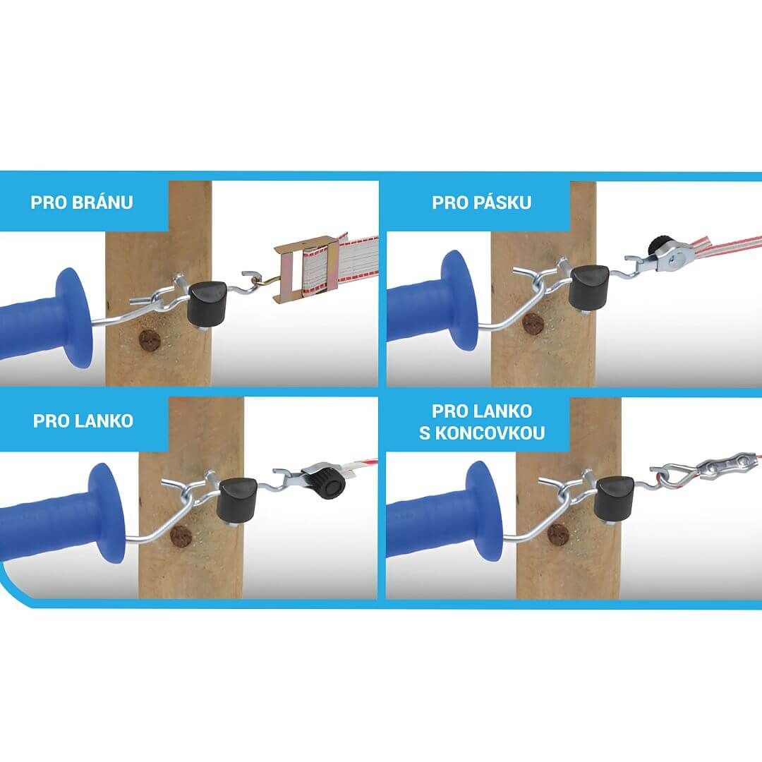 Bránovový izolátor se zahnutou podpěrou a dvěma háčky pro elektrický ohradník.