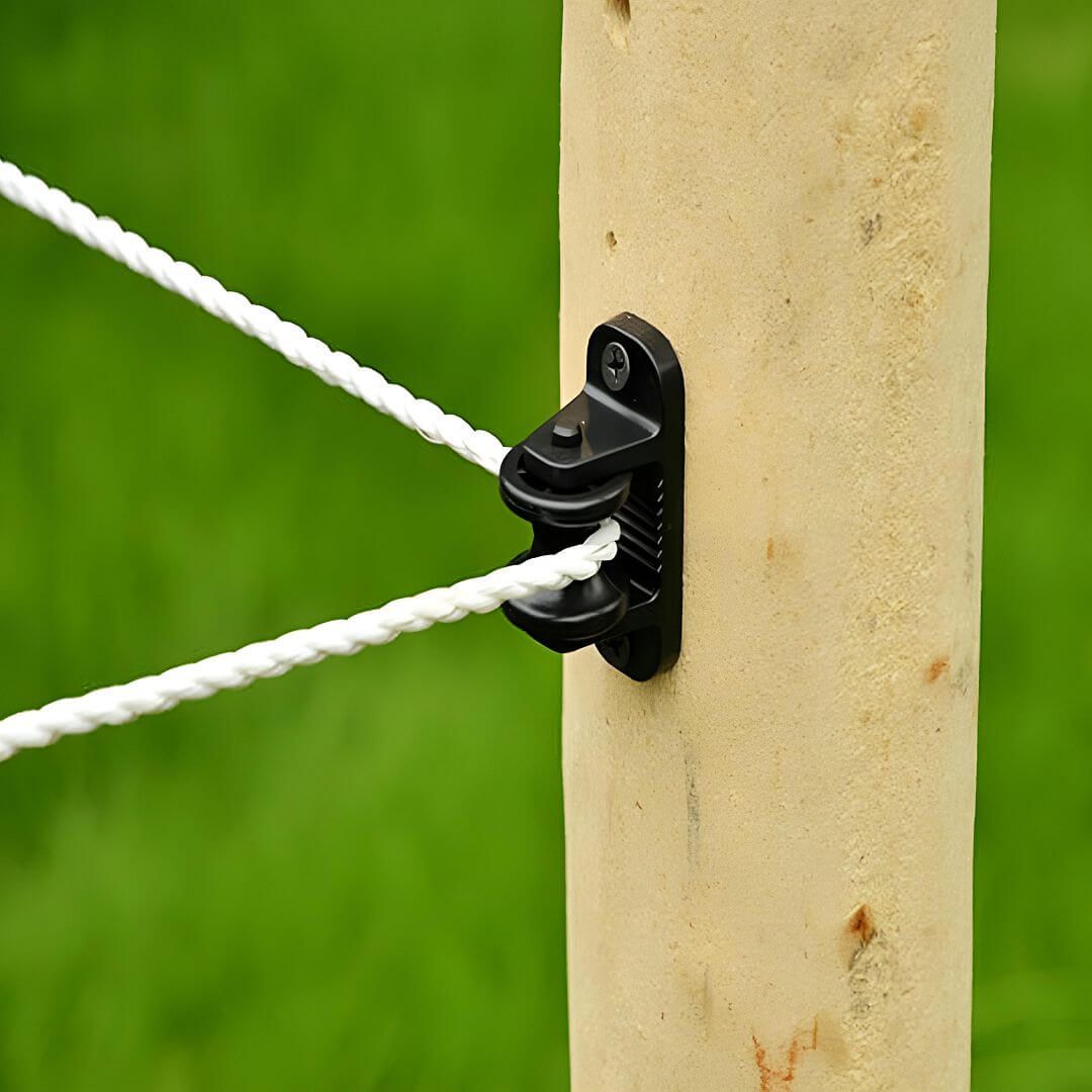 Rohový plně otočný izolátor pro elektrický ohradník s odnímatelnou plastovou rolnou.