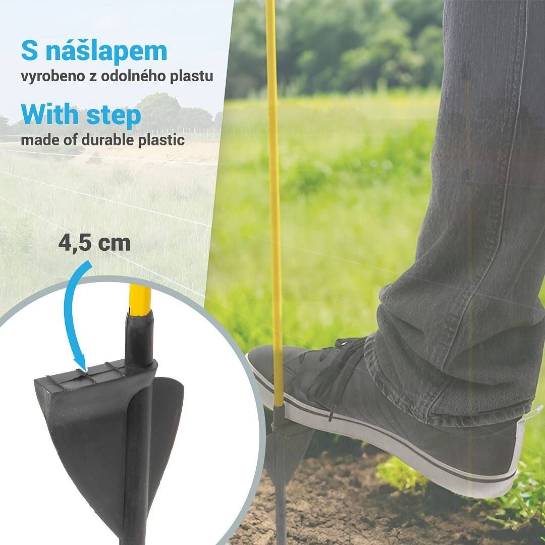 Popis výrobku Sklolaminátové oválné tyčky pro ohradník 110 cm s nášlapem, hrotem a 2 izolátory - 100 ks