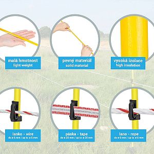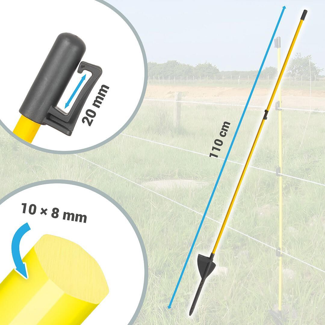 Sklolaminátové oválné tyčky pro ohradník 110 cm s nášlapem, hrotem a 2 izolátory - 100 ks
