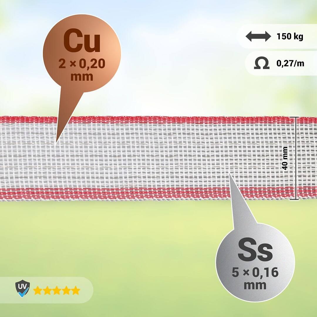 Páska pro elektrický ohradník, šířka 40 mm, bílo-červená, 200 m, 0,2 Ω/m