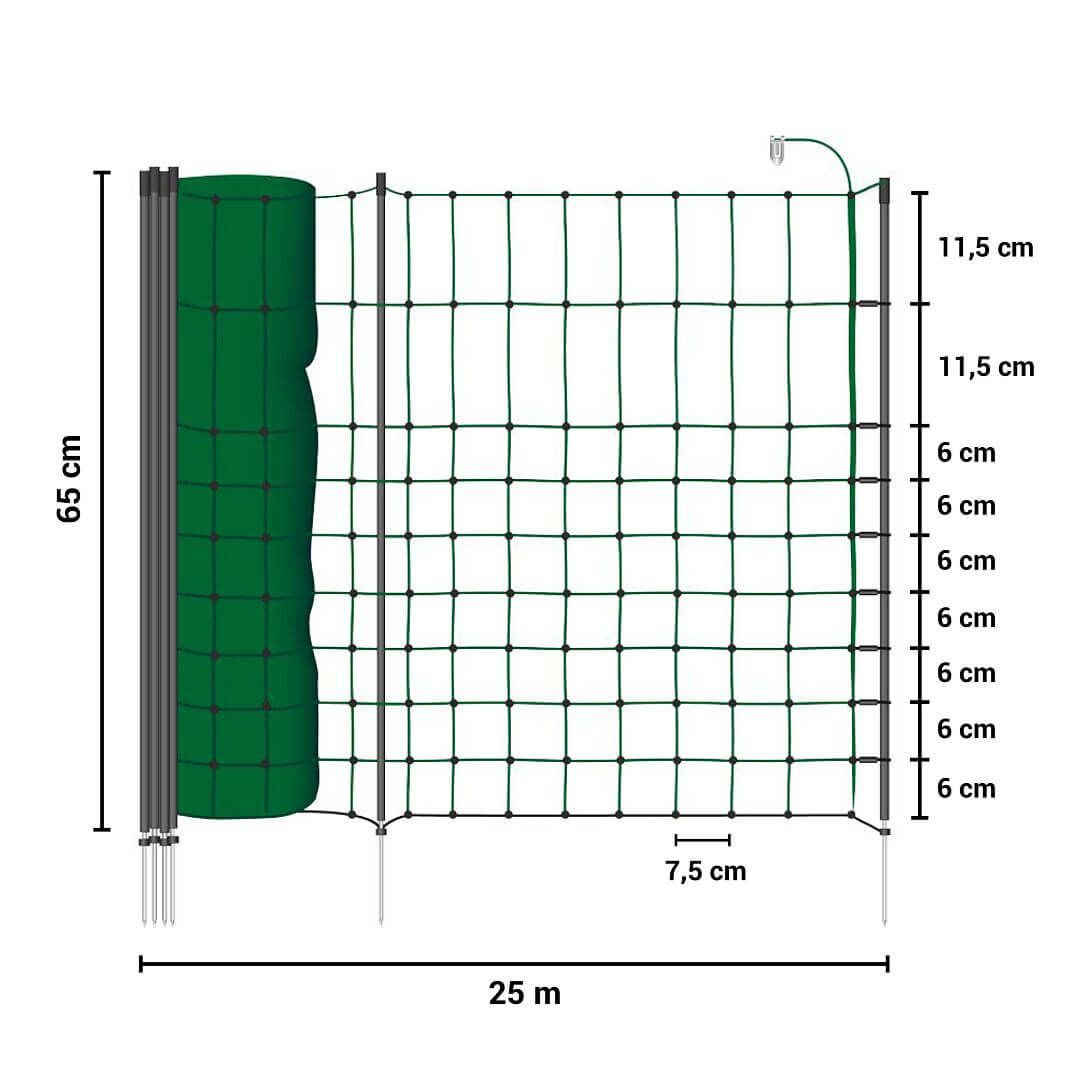 Zelená síť STANDARD pro elektrický ohradník pro psy, králíky, kočky, výška 65 cm, 25 m, 1 hrot + 7 dalších