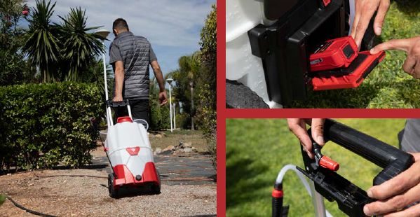 Postřikovač nabízí tři volitelné stupně výkonu s maximálním pracovním tlakem až 4 bary. Zvolený stupeň udržuje konstantní tlak a velikost kapek, což zajišťuje vysokou kvalitu a efektivitu aplikace. Výkonná baterie a čerpadlo postřikovače umožňuje práci až po dobu 7 hod.