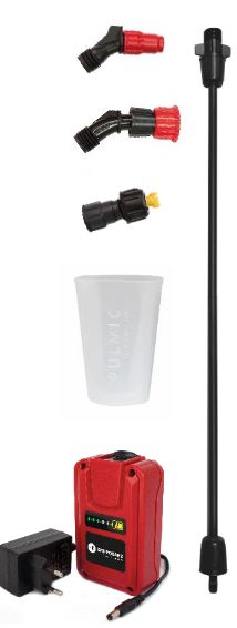 Součástí standardní dodávky jsou navíc tři různé trysky, 50 cm prodlužovací trubka, Li-Ion baterie a nabíječka.