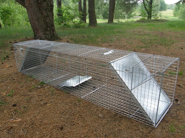 Konstrukce u vchodu zesílená silným drátem zajišťuje stabilitu a pevnost pasti. Padací dvířka jsou vyztužena úhelníky.