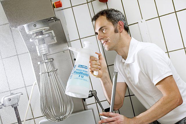 Ruční postřikovač FoodMaster F12 lze bezpečně využívat pro každodenní nasazení při zpracování a přípravě potravin.