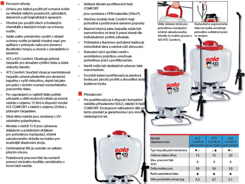 Technické parametry zádového postřikovače SOLO 425 Comfort