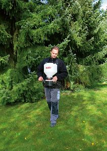 Přenosné rozmetadlo je ideální aplikátor granulovaných materiálů, např. hnojiv trávníku, chemických přípravků, ale i semen a krmiv. Stroj se nese na hrudi zavěšený na popruhu přes jedno rameno. Posypový materiál propadává ze zásobníku, který pojme až 9 kg. Integrovaný mechanizmus zajišťuje rovnoměrné dávkování materiálu na klikou poháněný, rovnoměrně rotující talíř. V nerovném terénu, kde nelze použít například pojízdné rozmetadlo, můžete cíleně rozprášit až 9 kg granulovaného materiálu. Rozmetadlo se nosí zavěšené vpředu na nastavitelném popruhu. Velký plnicí otvor umožňuje snadné naplnění a víko se závitem chrání uživatele před škodlivým prachem.